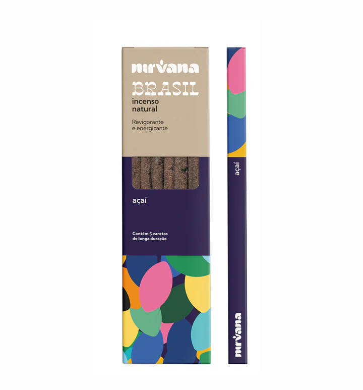 Composição: Blend terapêutico Nirvana (mix de resinas naturais, ervas, óleos essenciais e especiarias), varetas de bambu, pó de madeira, aglutinante, essência, açaí in natura em pó.